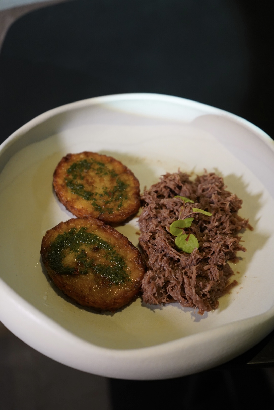 Разработанное нами направление - температурный фуд: всё не то, чем кажется. Картофельные котлеты и пюре из рваной говядины.