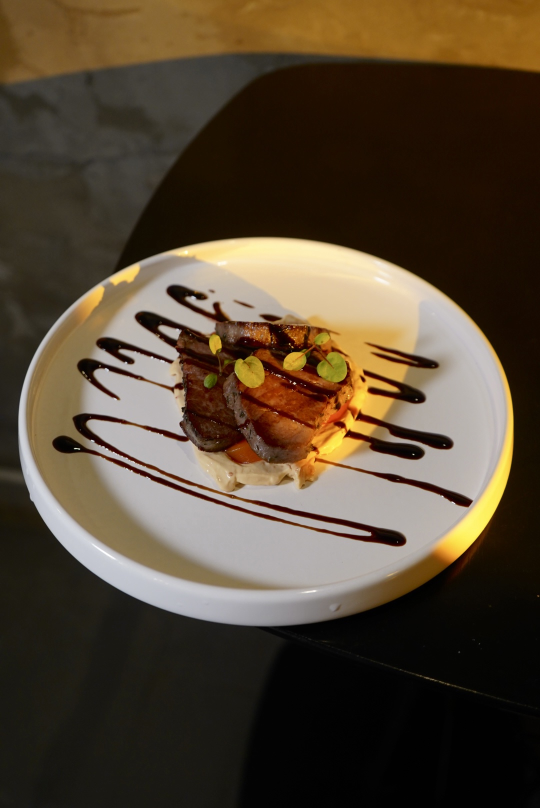 Говядина су-вид, крем из творожного сыра, печёные перцы, бальзамик.