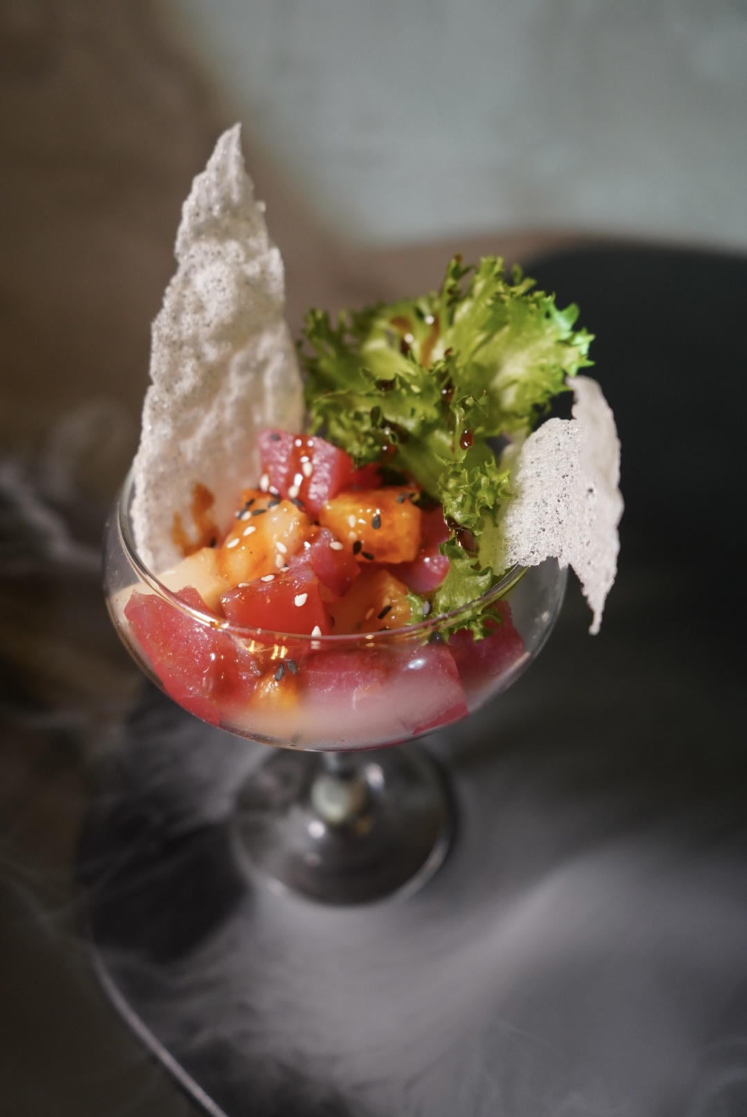 Тунец, ананас, апельсин, кизиловый бальзамик.