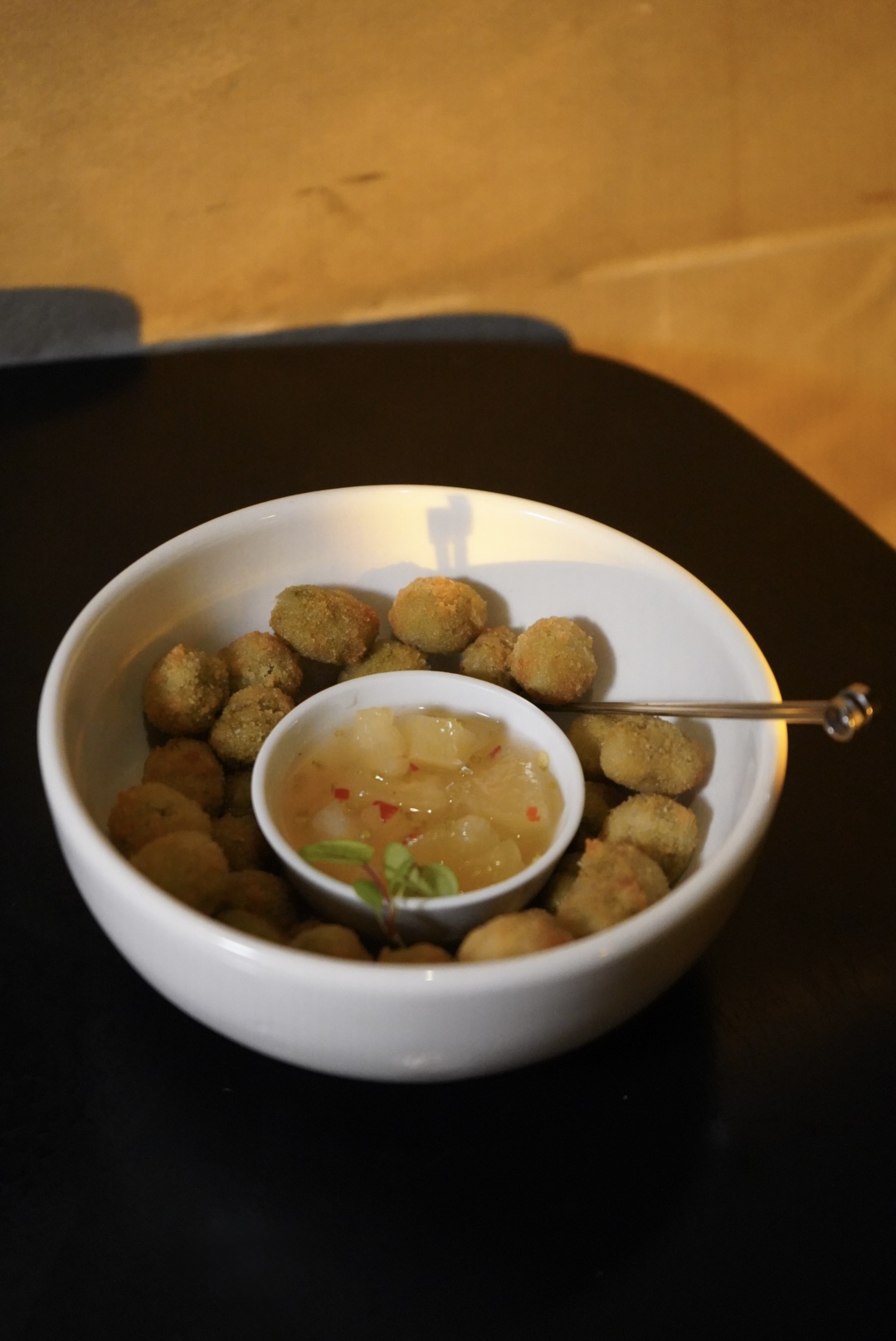 Оливки в панировке с ананасовым чатни.